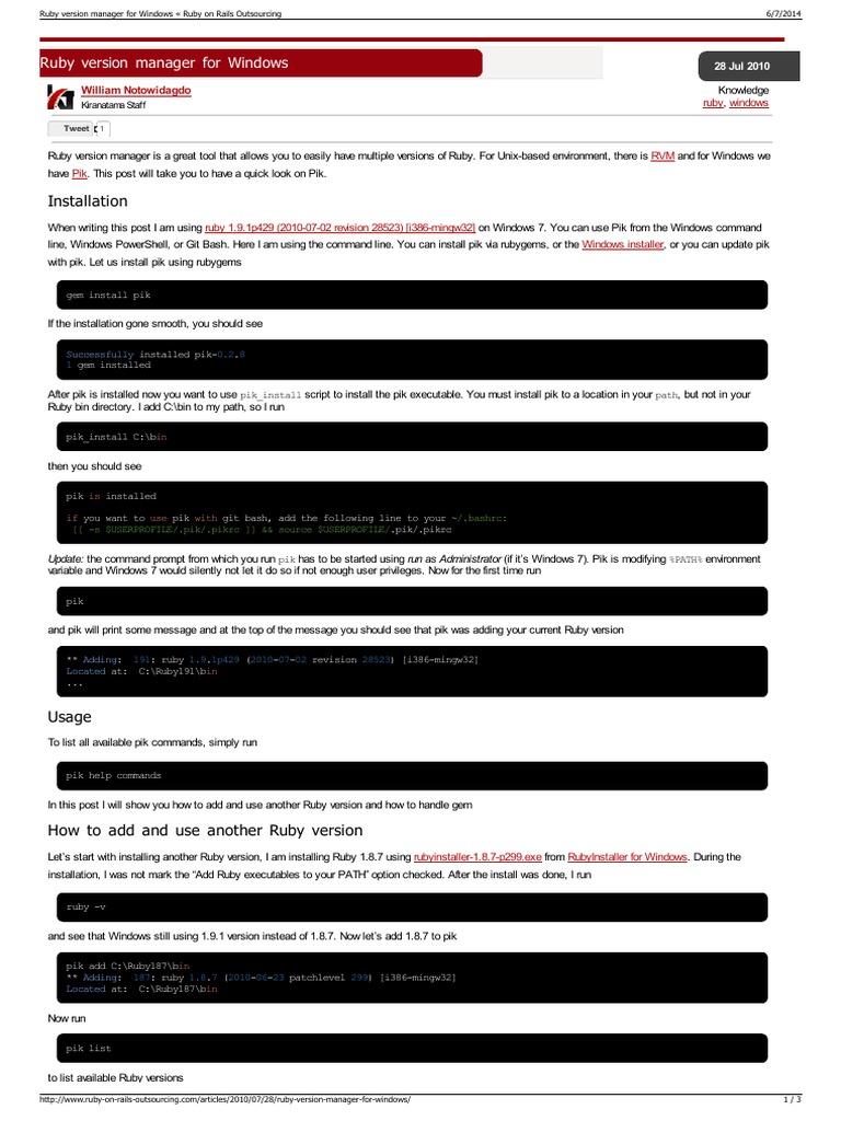 Windows is only supported if using the windows subsystem for linux and uses the same. Ruby version manager (rvm) creates an isolated installation of ruby in your $home directory. Pik is quite old and not maintained any more but still can be used for managing installed rubies. Also, can you use ruby on windows?